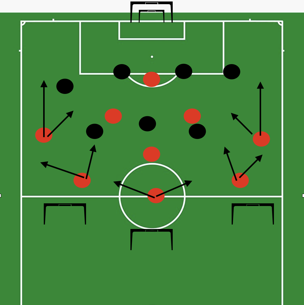 Set up: 7 v 8 2/3rds of the pitch x1 full size goal, x3 9-a-side goals